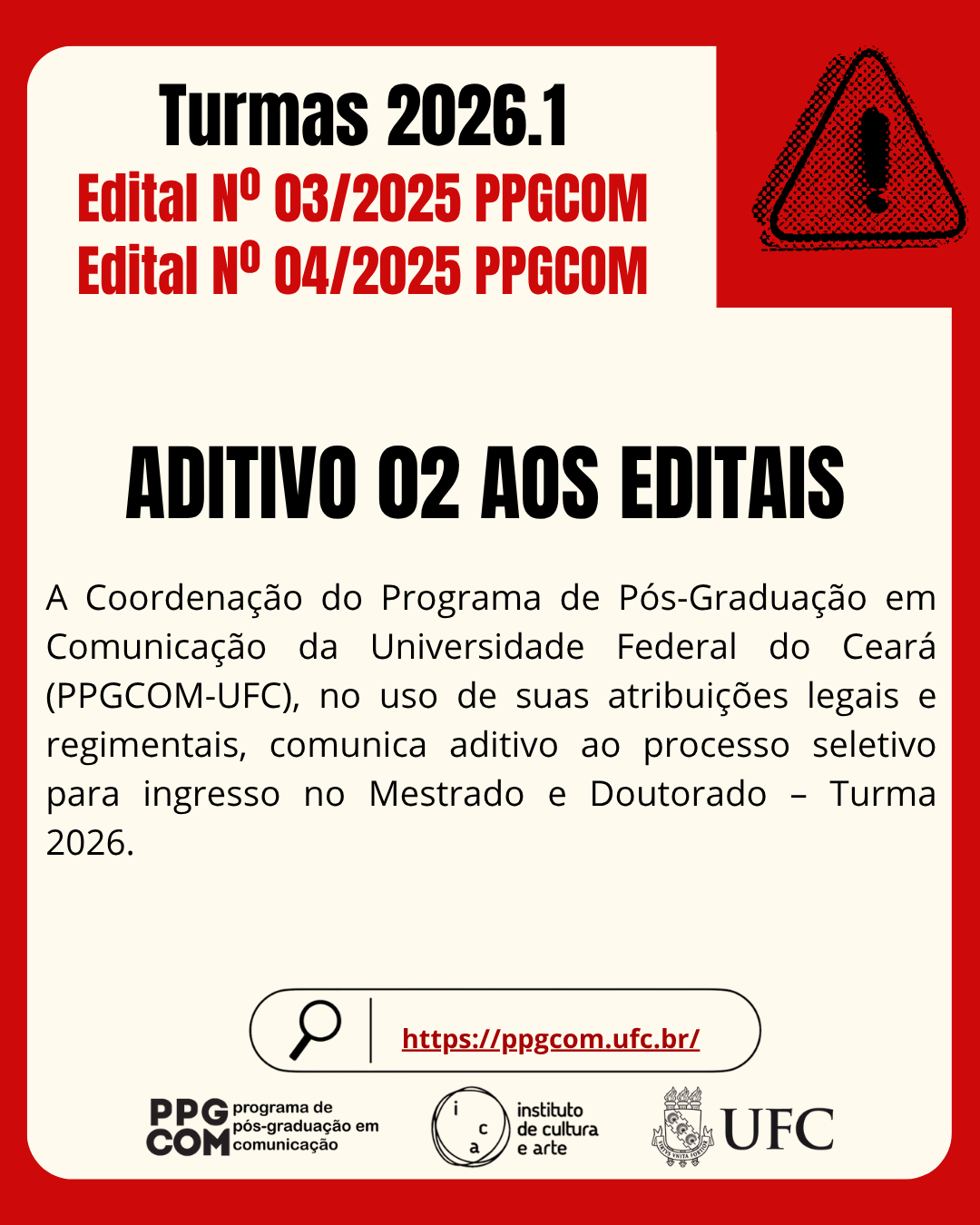 Data da publicação: 19 de novembro de 2025 Categoria: Edital, Notícias, Processo SeletivoA Coordenação do Programa de Pós-Graduação em Comunicação da Universidade Federal do Ceará (PPGCOM-UFC), no uso de suas atribuições legais e regimentais, comunica aditivo ao processo seletivo para ingresso no Mestrado e Doutorado – Turma 2026.