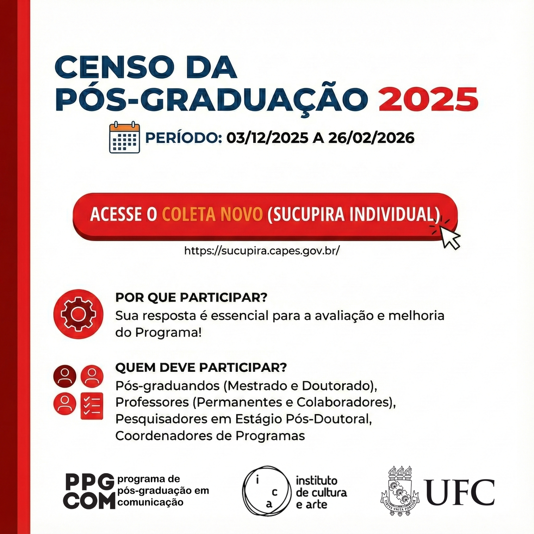 A Coordenação do Programa de Pós-Graduação em Comunicação da Universidade Federal do Ceará (PPGCOM-UFC) torna público o resultado final da Prova de Títulos – quinta etapa do processo seletivo para o processo seletivo do Edital para a Turma 2026 do Mestrado e Doutorado em Comunicação da UFC. Informamos aos candidatos elencados nesse resultado que todos já se […] Censo da Pós-Graduação 2025 – Docentes, discentes e pós-doutorandos do PPGCOM deve obrigatoriamente participar.
