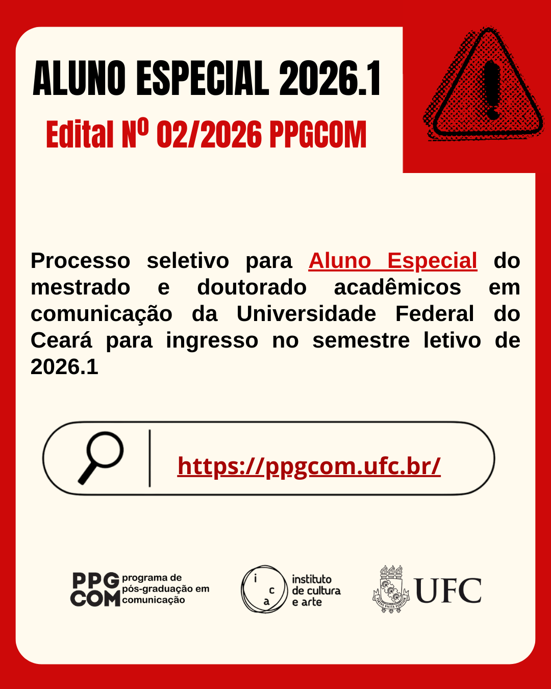 Data da publicação: 13 de fevereiro de 2026 Categoria: Aluno Especial, NotíciasO Programa de Pós-Graduação em Comunicação da Universidade Federal do Ceará (PPGCOM/UFC) torna público as inscrições para aluno especial em Disciplinas da Pós-Graduação em Comunicação da UFC para o semestre letivo de 2026.1 na Área de Concentração: Meios e Processos Comunicacionais e nas seguintes linhas de pesquisa: Linha 1 – Comunicação, Imagem e Som, Linha 2 – Comunicação e Práticas Socioculturais e Linha 3 – Estudos em Jornalismo.