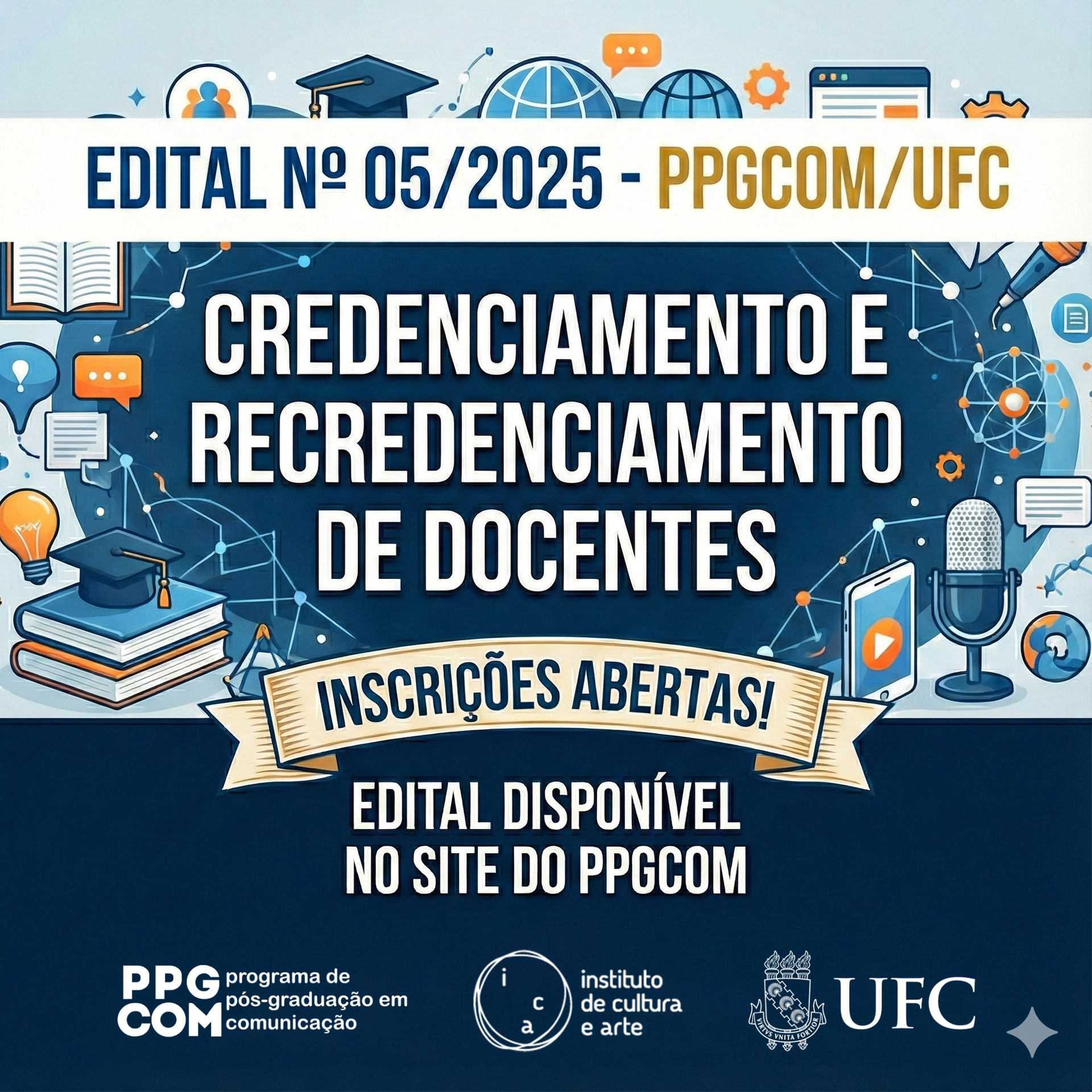 Data da publicação: 15 de dezembro de 2025 Categoria: Credenciamento de Docentes, Edital, NotíciasO Programa de Pós-Graduação em Comunicação da Universidade Federal do Ceará (PPGCOM/UFC) torna público o lançamento do Edital Nº 05/2025, referente ao processo de seleção para o Credenciamento e Recredenciamento de Docentes.