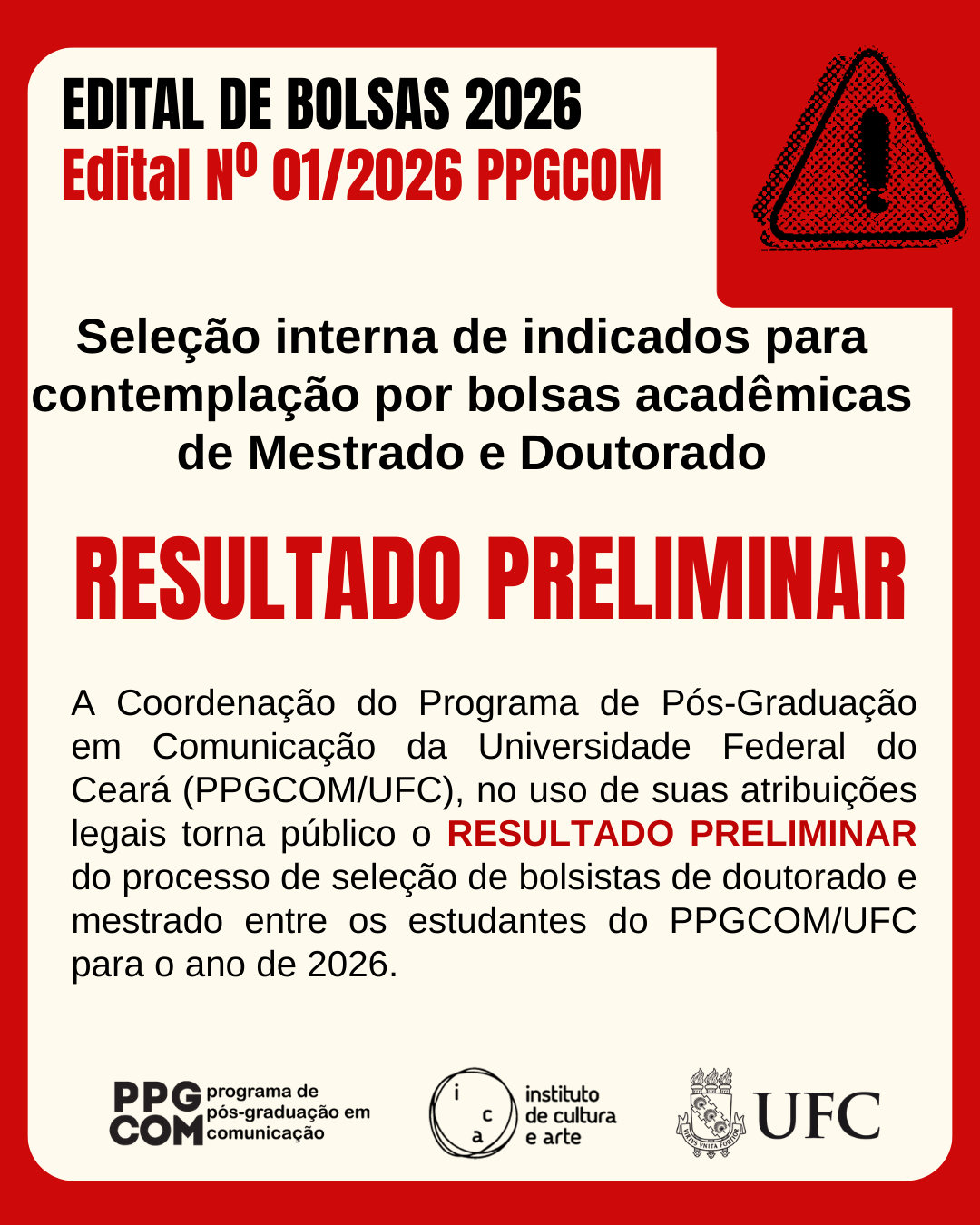 Data da publicação: 3 de março de 2026 Categoria: Bolsa de Pesquisa, Edital, NotíciasA Coordenação do Programa de Pós-Graduação em Comunicação da Universidade Federal do Ceará (PPGCOM/UFC), no uso de suas atribuições legais e em conformidade com o ARTIGO 9° DA PORTARIA CAPES Nº 76, DE 14 DE ABRIL DE 2010 – REGULAMENTO DO PROGRAMA DE DEMANDA SOCIAL – DS/CAPES, com a PORTARIA 133 DE 10 DE JULHO DE 2023, QUE REGULAMENTA O ACÚMULO DE BOLSAS DE MESTRADO, DOUTORADO E PÓS-DOUTORADO CONCEDIDAS PELA CAPES NO PAÍS COM ATIVIDADE REMUNERADA OU OUTROS RENDIMENTOS, com a INSTRUÇÃO NORMATIVA N° 03/2023 DA FUNCAP e com INSTRUÇÃO NORMATIVA AD REFERENDUM 01/CPPG/CEPE, DE 20 DE SETEMBRO DE 2023 torna público o RESULTADO PRELIMINAR do processo de seleção de bolsistas de doutorado e mestrado entre os estudantes do PPGCOM/UFC para o ano de 2026, , o qual foi regido pelo Edital 01/2025.